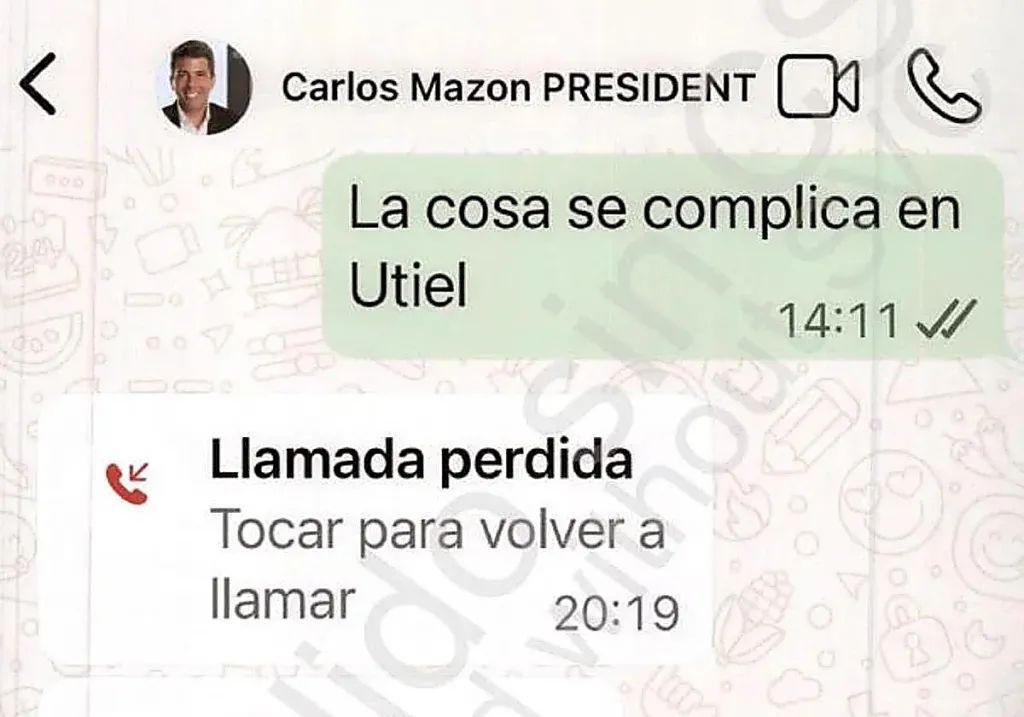 Pero lo más llamativo de estas comunicaciones es, sin duda, el mensaje de Salomé Pradas a las 14.11 horas, pocos minutos antes de que el presidente llegara al restaurante El Ventorro. «La cosa se complica en Utiel», le dijo. Nunca recibió respuesta a esa información. Fue entonces cuando comenzó una comida y sobremesa que se prolongó durante cinco horas, en el peor momento de la dana.