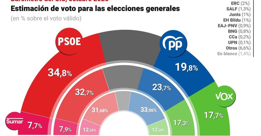 El Barómetro de Opinión del Centro de Investigaciones Sociológicas (CIS) del mes de octubre coloca al PSOE quince puntos por encima del PP, con una estimación de voto del 34,8% por el 19,8% de los 'populares', y pone a Vox a sólo dos puntos de los de Alberto Núñez Feijóo.