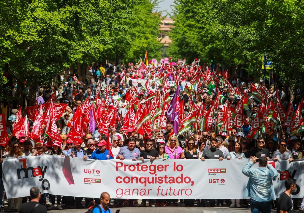 Cientos de personas marchan por Gran Vía de Granada en defensa de los derechos sociales y laborales. Desde CCOO han liderado una «movilización masiva» que ha comenzado alrededor de las 12.30 horas desde los Jardines del Triunfo.