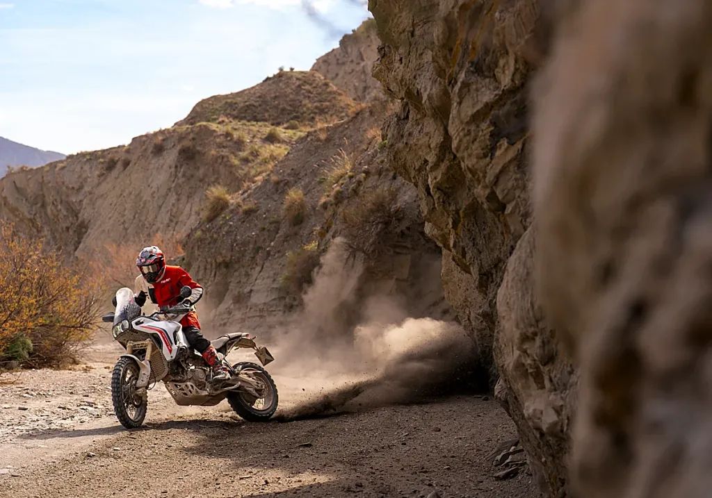 Este nuevo bicilíndrico de 890 cm³ con sistema de distribución variable IVT ofrece una potencia máxima de 110 CV a 9.000 rpm, y tiene un par máximo de 92 Nm, con una curva más sostenida que el modelo anterior: el 70 % del valor máximo ya está disponible a 3.000 rpm. Las relaciones de cambio diseñadas específicamente para la DesertX ofrecen cuatro marchas cortas para superar los obstáculos más difíciles y una sexta marcha más larga para mejorar el consumo de combustible y el confort durante los recorridos rápidos.